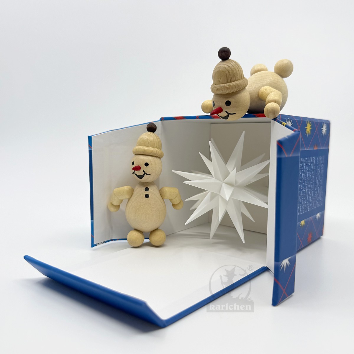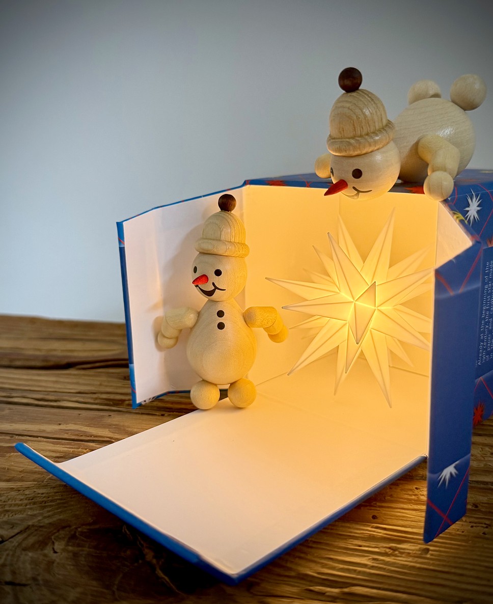 Karton (Schneemänner sind am Karton befestigt, Stern wird aufgesteckt), in hochwertiger Handarbeit gefertigt